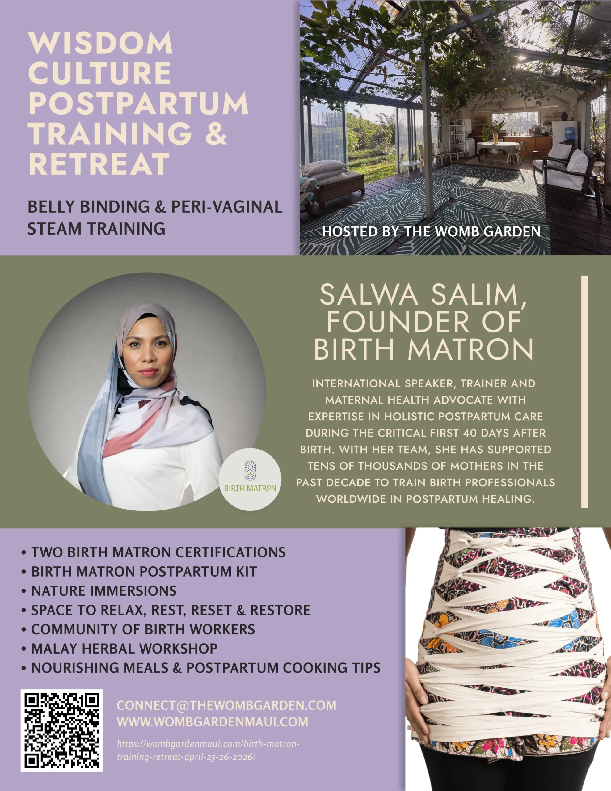 Led by Salwa Salim, founder of Birth Matron, with other 5 facilitators, this training offers hands-on learning in traditional postpartum care while allowing space for rest, nourishment, and integration.